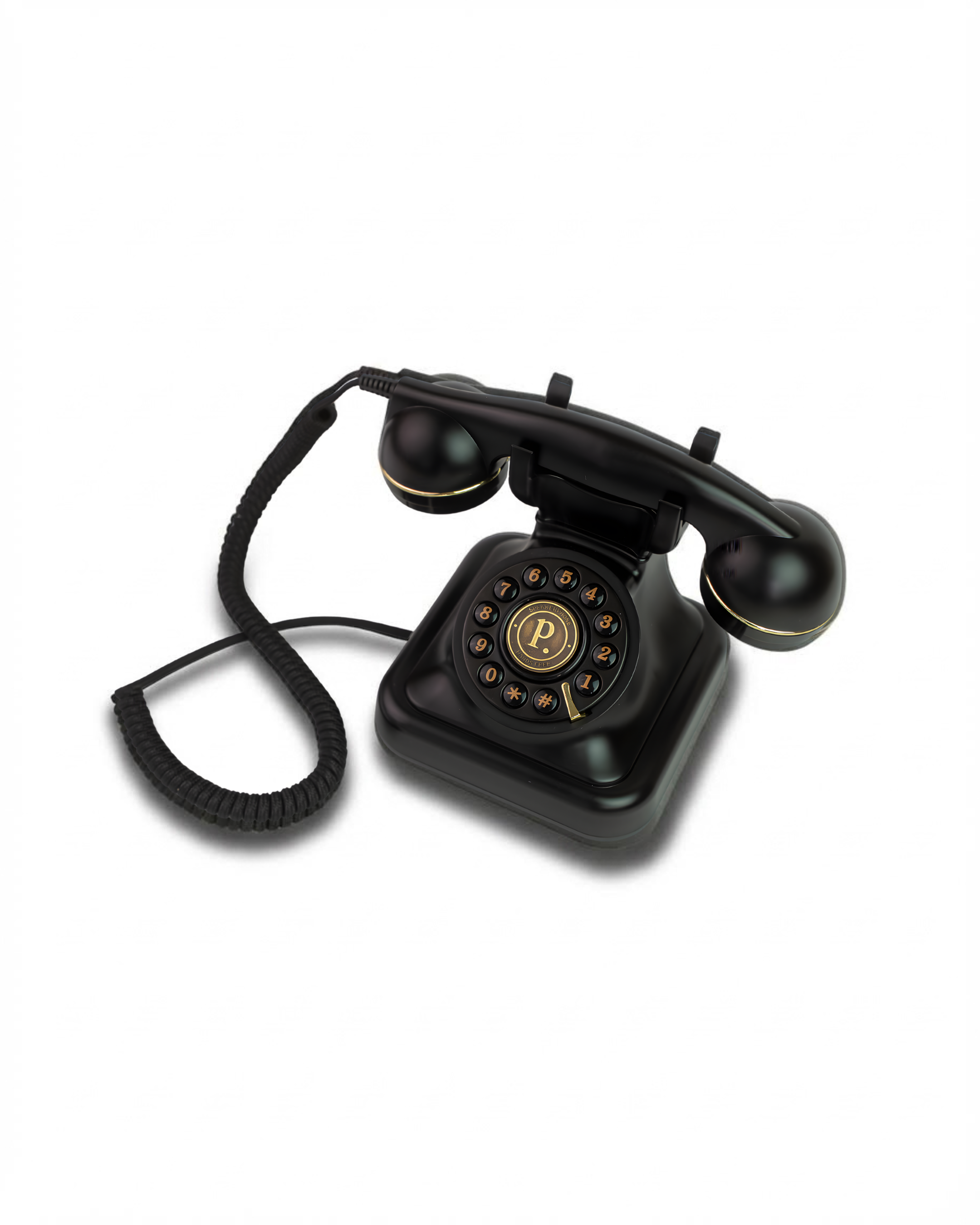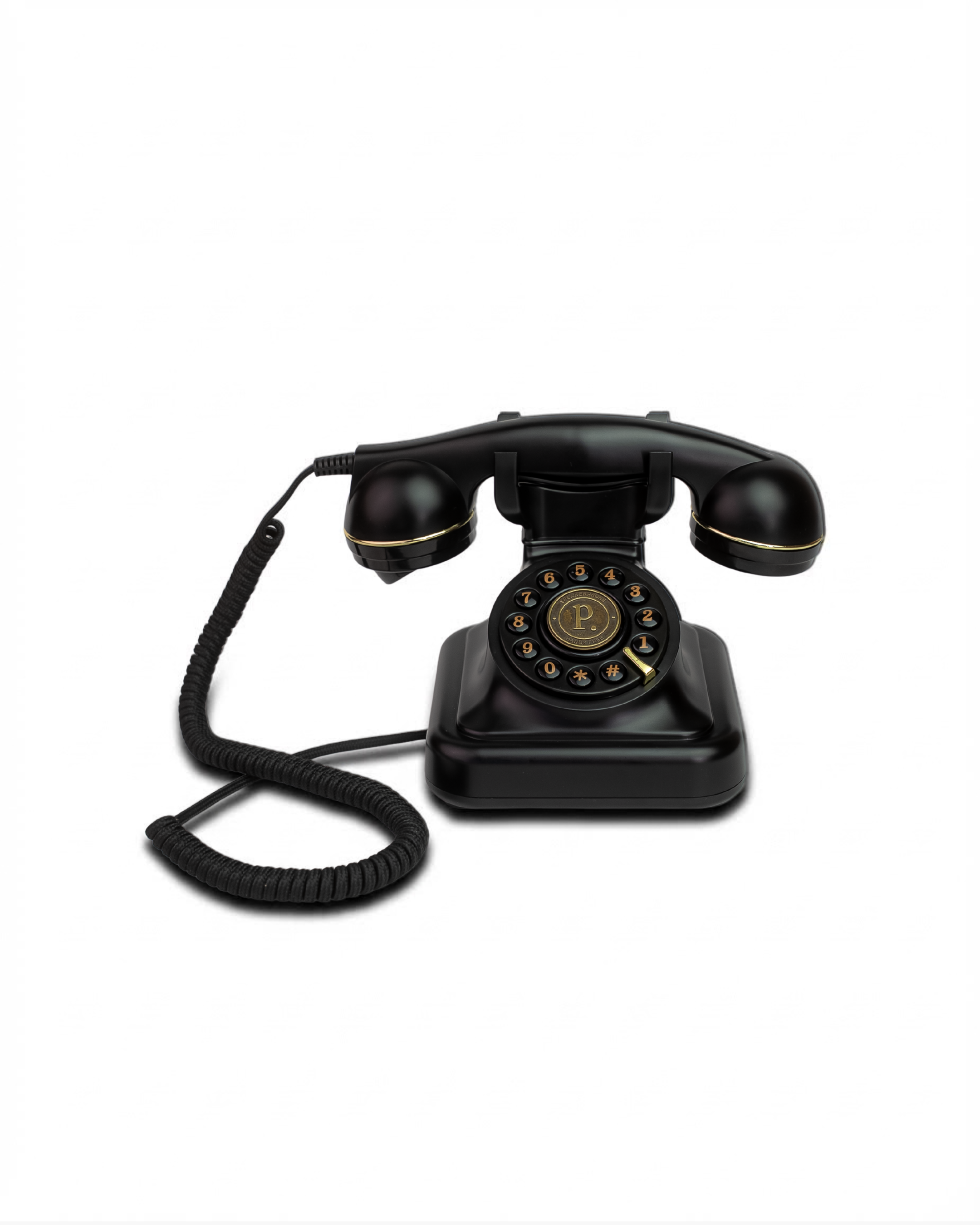 Bluetooth-compatible, rotary-style phone with push-button dialing in a vintage silhouette with brass accents.