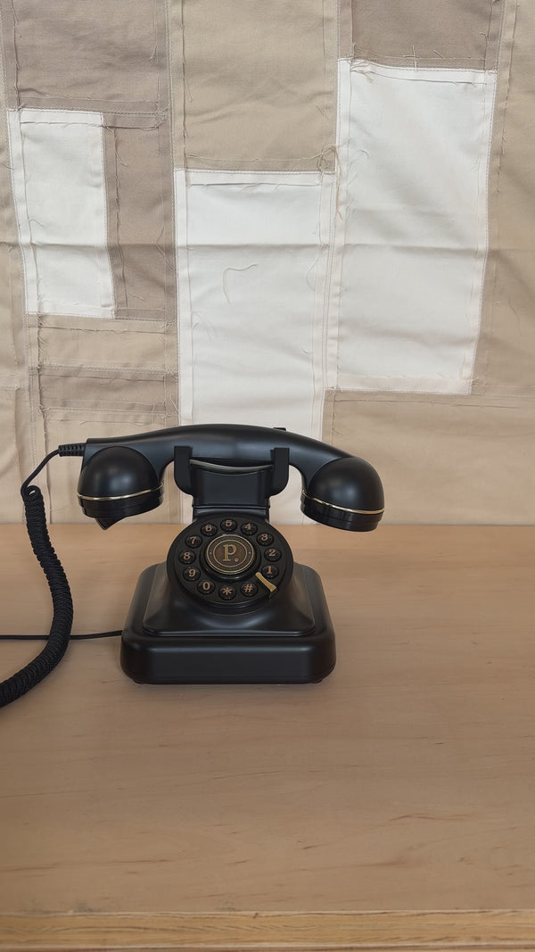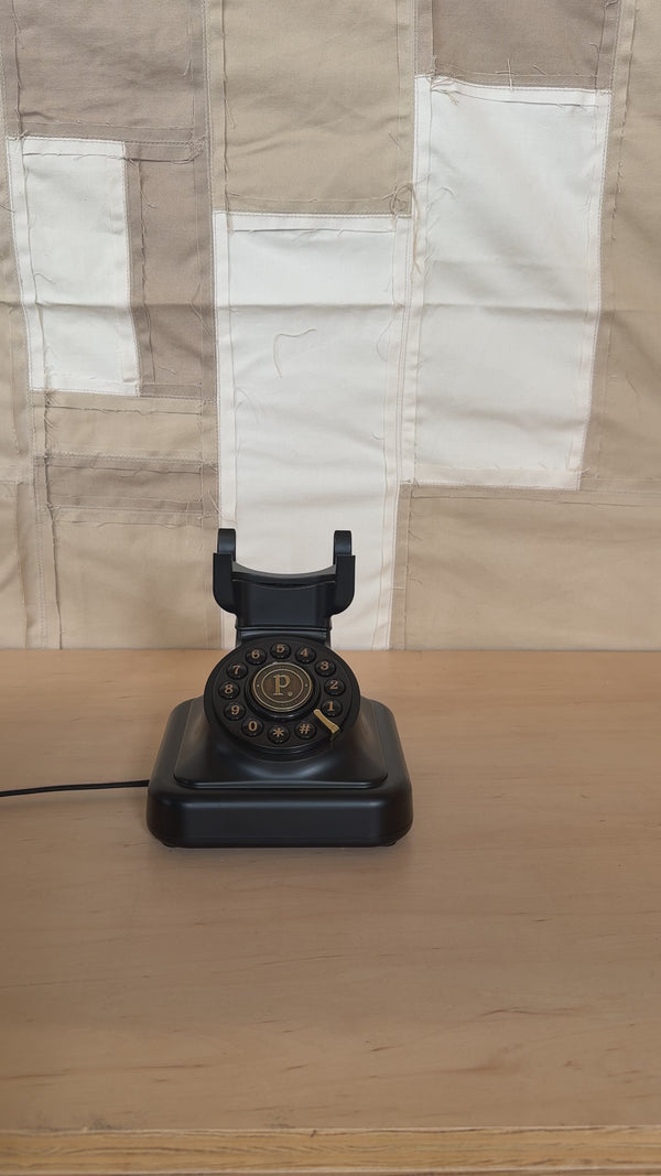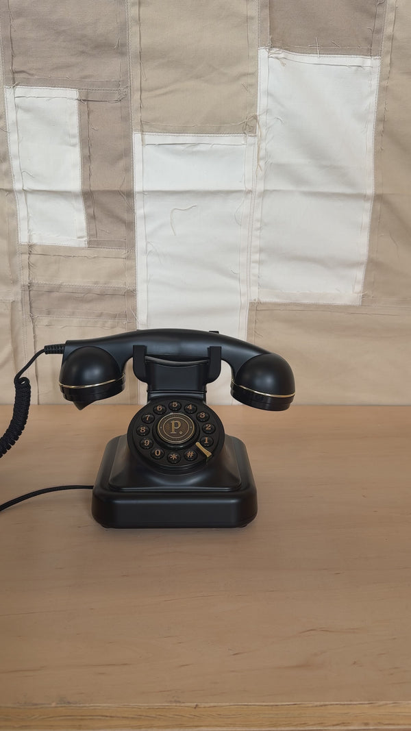 Bluetooth-compatible, rotary-style phone in midnight black with push-button dialing in a vintage silhouette with brass accents.